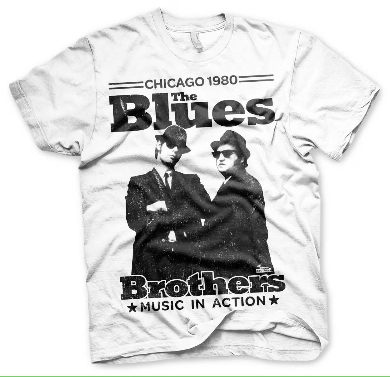 T-paita Blues Brothers Chicago 1980. Valkoinen T-paita, jossa Blues Brothers -printti.
