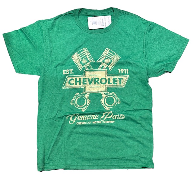 T-paita Chevrolet, vihreä. Värisävy voi vaihdella erästä riippuen. Printti edessä, materiaali 50 % puuvilla, 50 % polyesteri.
