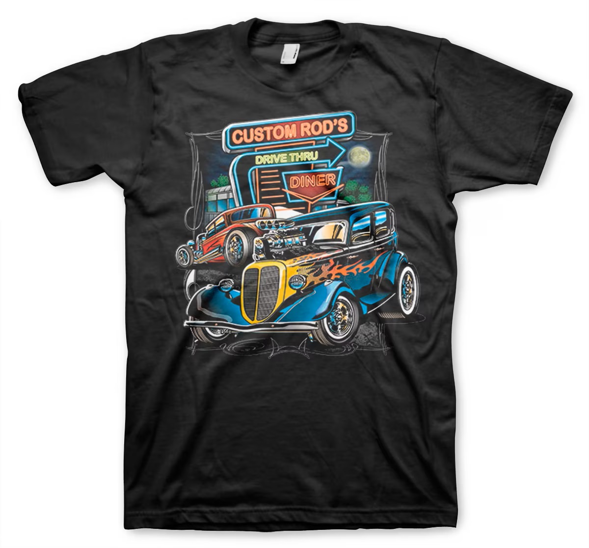 T-paita Custom Rod's Drive Through. Musta T-paita isolla etuprintillä.