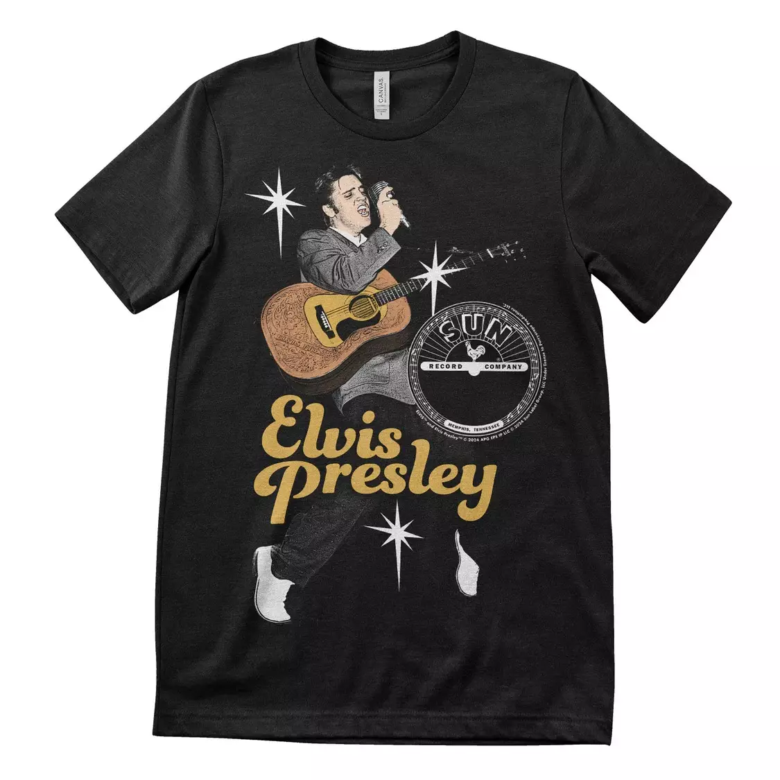 T-paita Elvis Presley Sun Record, Elvis On Toe. Musta T-paita isolla etuprintillä, pehmeää 100 % puuvillaa.