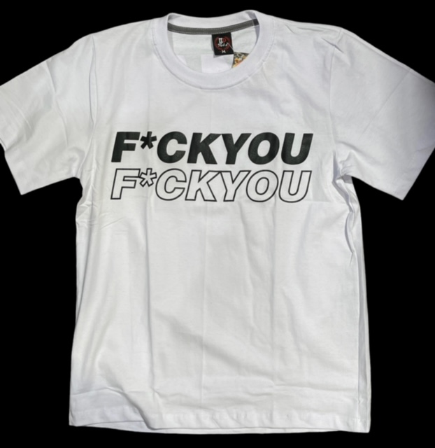T-paita F*ck You, valkoinen. Valkoinen T-paita 100 % puuvillaa, jossa edessä tekstiprintti F*ck You ja takana selässä on iso kumimainen painatus.