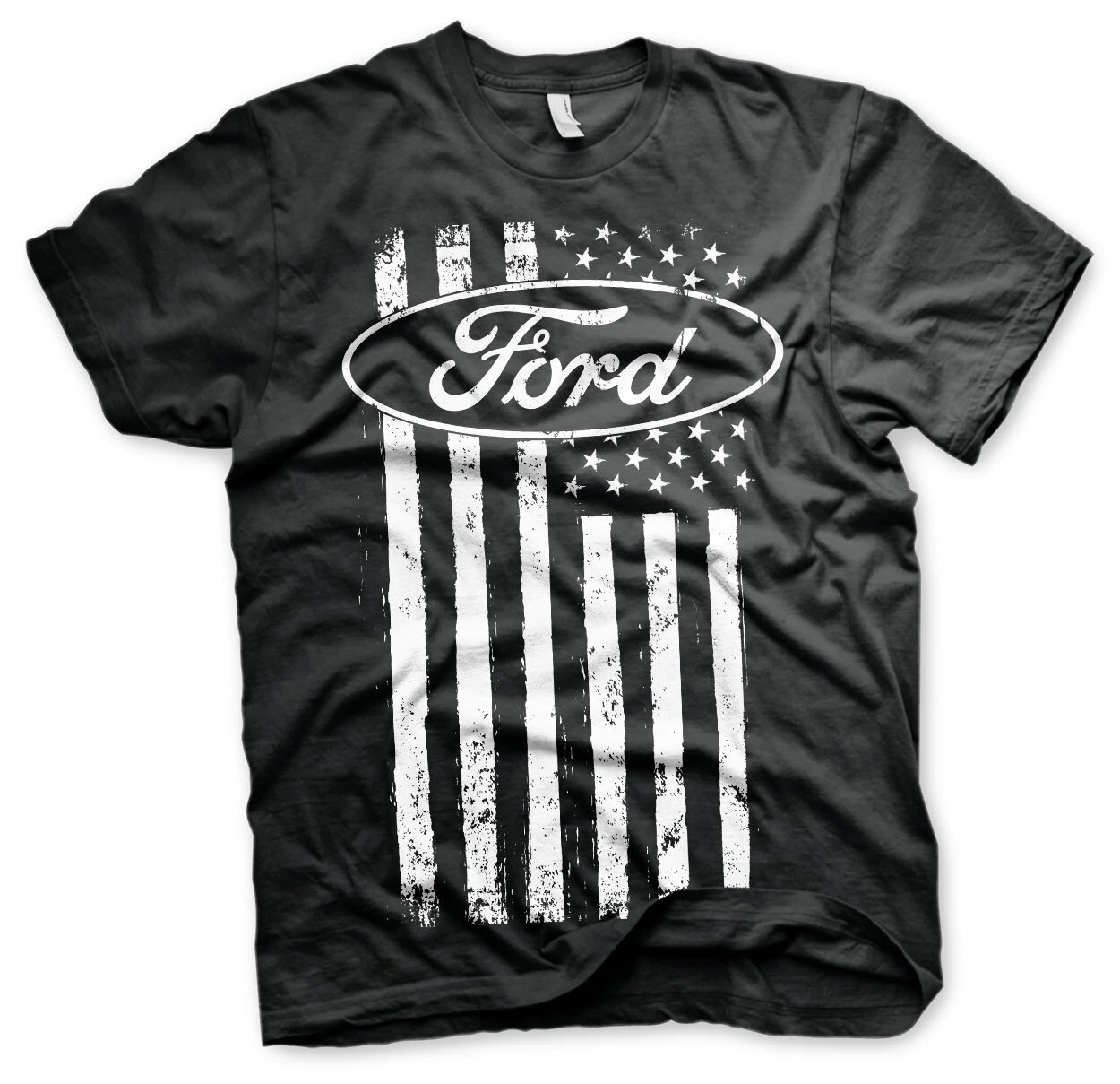 Musta T-paita Ford USAn lippu, valkoisella etuprintillä. Materiaali 100 % puuvilla.