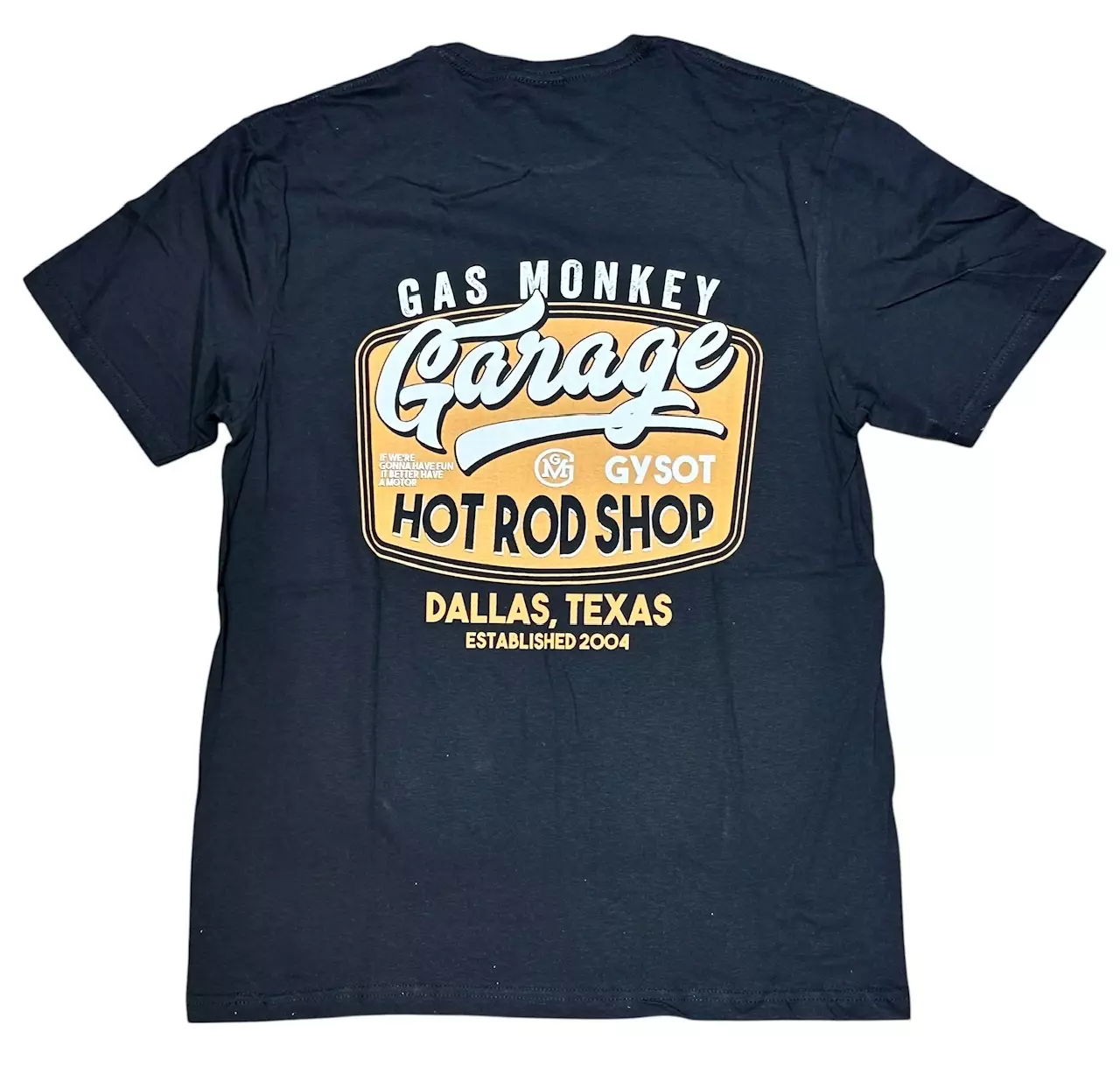 T-paita, Gas Monkey Rusty Hot Rod. Musta T-paita, jossa edessä printattuna pieni GMG-logo ja selässä iso printti. Materiaali 100 % puuvillaa.