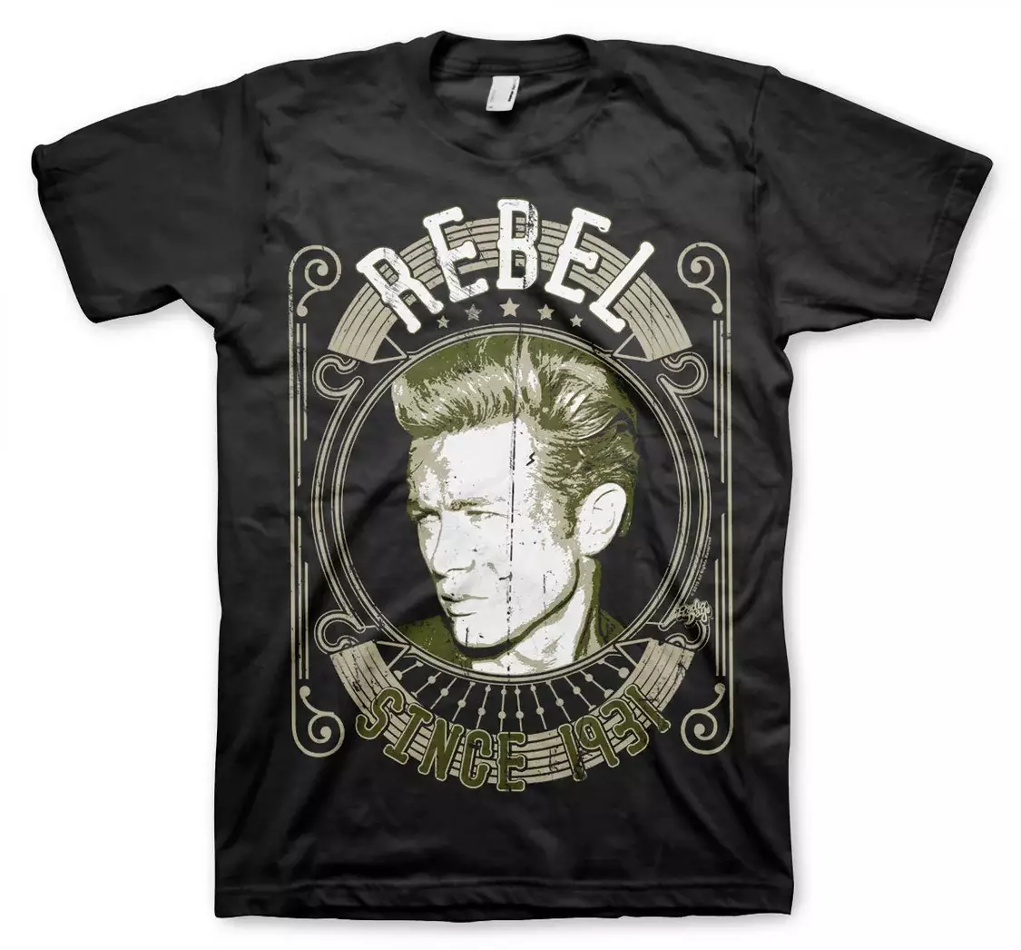 T-paita James Dean - Rebel Since 1931. Musta T-paita isolla etuprintillä, pehmeää 100 % puuvillaa.