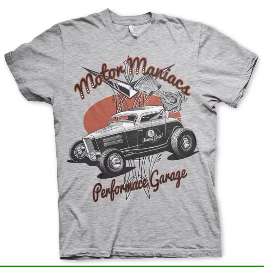 T-paita Motor Maniacs, meleerattu harmaa. T-paita isolla etuprintillä.
