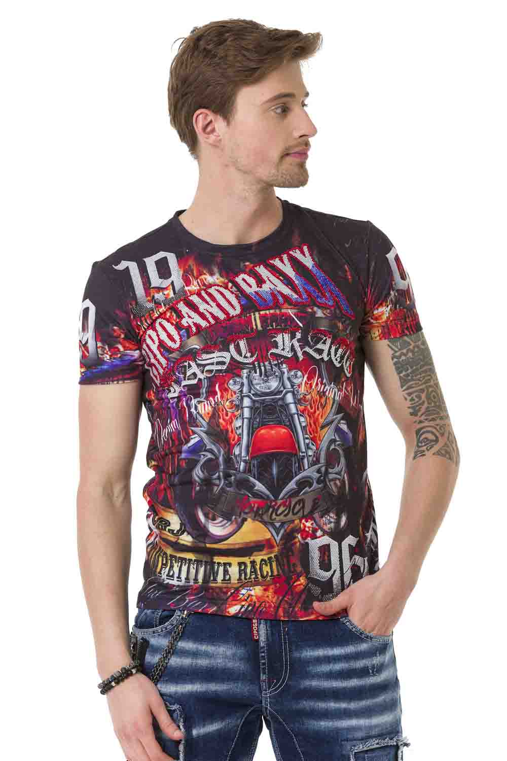 T-paita Motorcycles, Cipo & Baxx. Monivärinen printti allover, mustalla pohjalla. Lisäksi edessä tekstiä korostettu koristetimantein. Materiaali 50 % puuvilla, 50 % polyesteri.