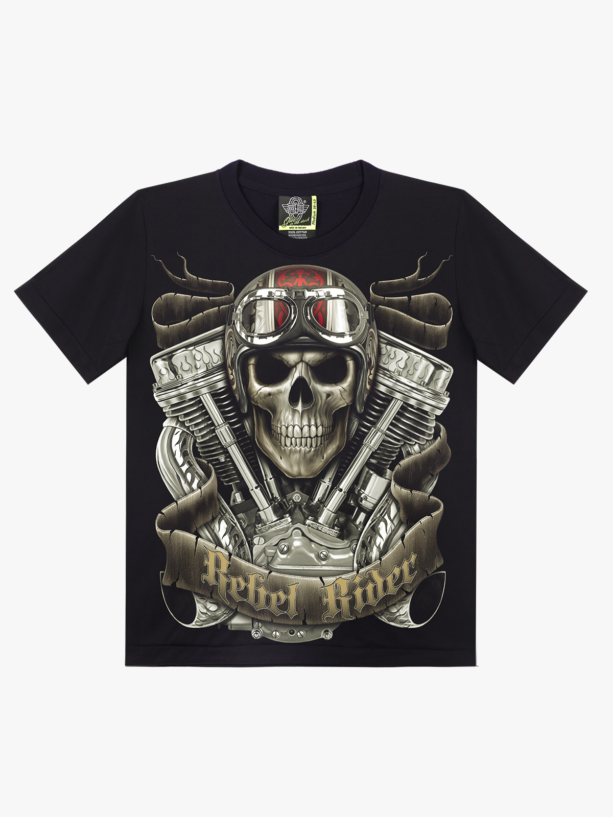 T-paita Rebel Rider. Musta puuvillainen T-paita, jossa printti sekä edessä että takana. materiaali 100 % puuvilla, hienopesu.