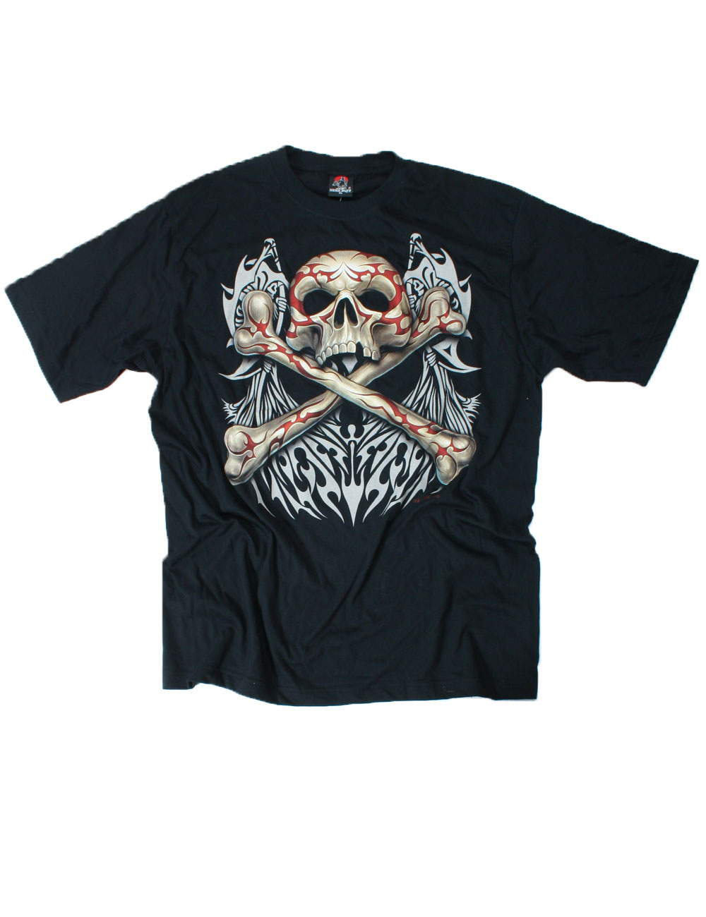 - Edessä väripainatuksella kallo ja luut punaisilla tribal kuvioilla, taustalla harmaita tribal kuvioita