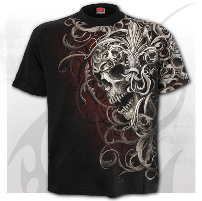 T-paita Skull Shoulder Wrap, Spiral. Musta T-paita upeilla printeillä. Materiaali 100 % puuvilla, hienopesu.
