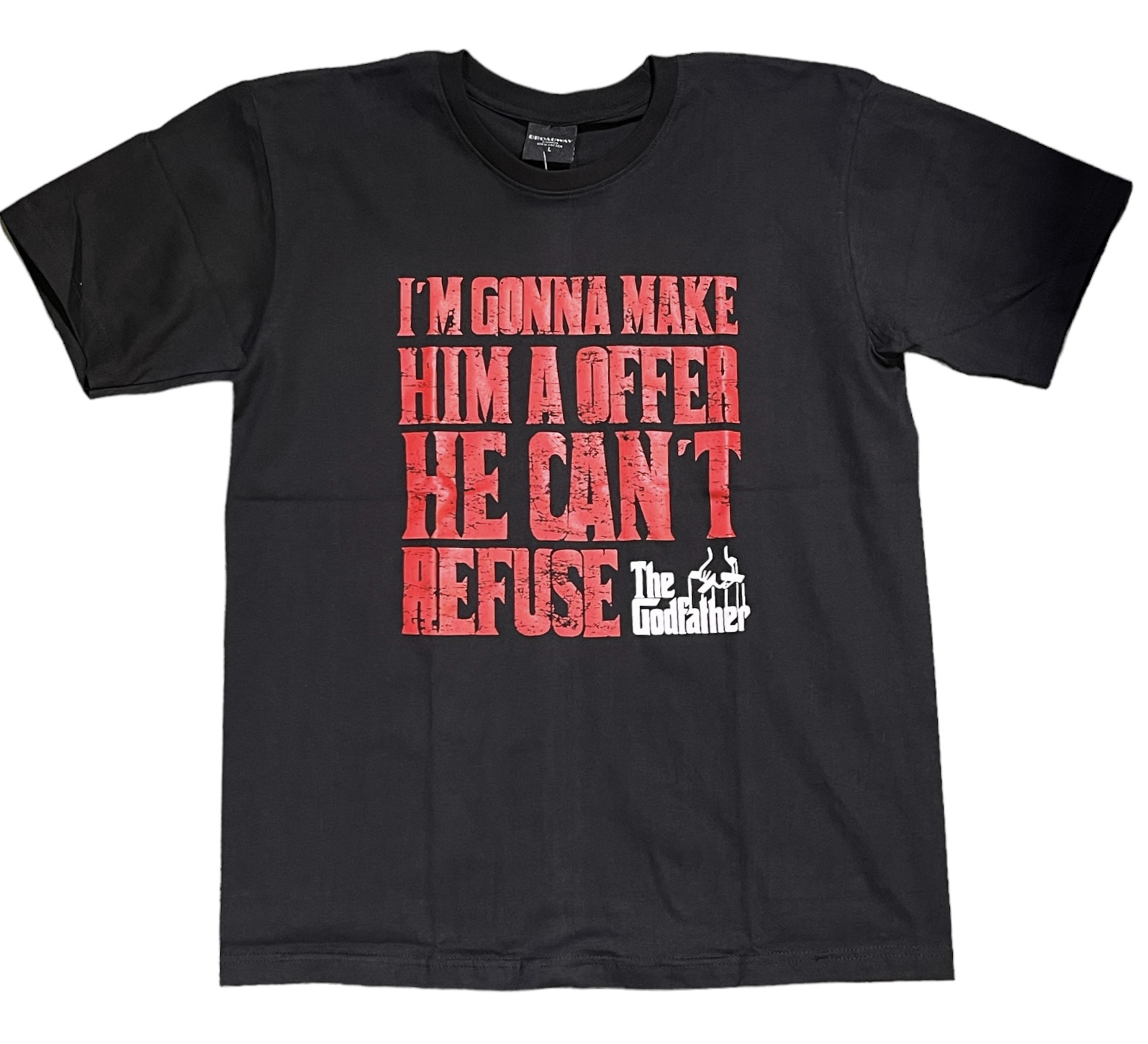 T-paita The Godfather punaisella tekstiprintillä. " I'm Gonna Make Him An Offer He Can't Refuse". Materiaali 100 % puuvilla, hienopesu.