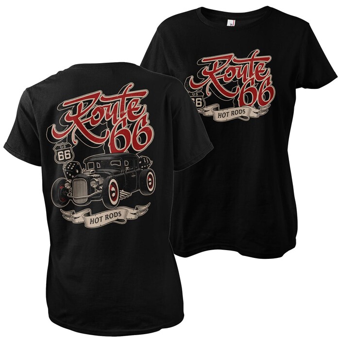 T-paita US 66 Hot Rods. Musta naisten T-paita, jossa painatukset sekä edessä, että takana. Materiaali 100 % puuvilla.