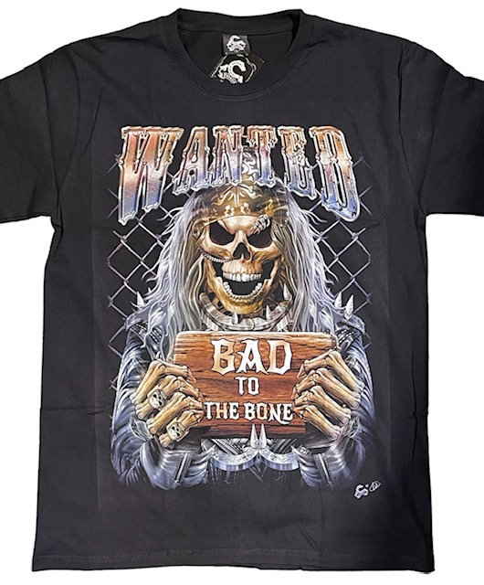 T-paita Wanted, Bad To The Bone musta. Iso printti sekä edessä että takana. Materiaali 100 % puuvilla, hienopesu.
