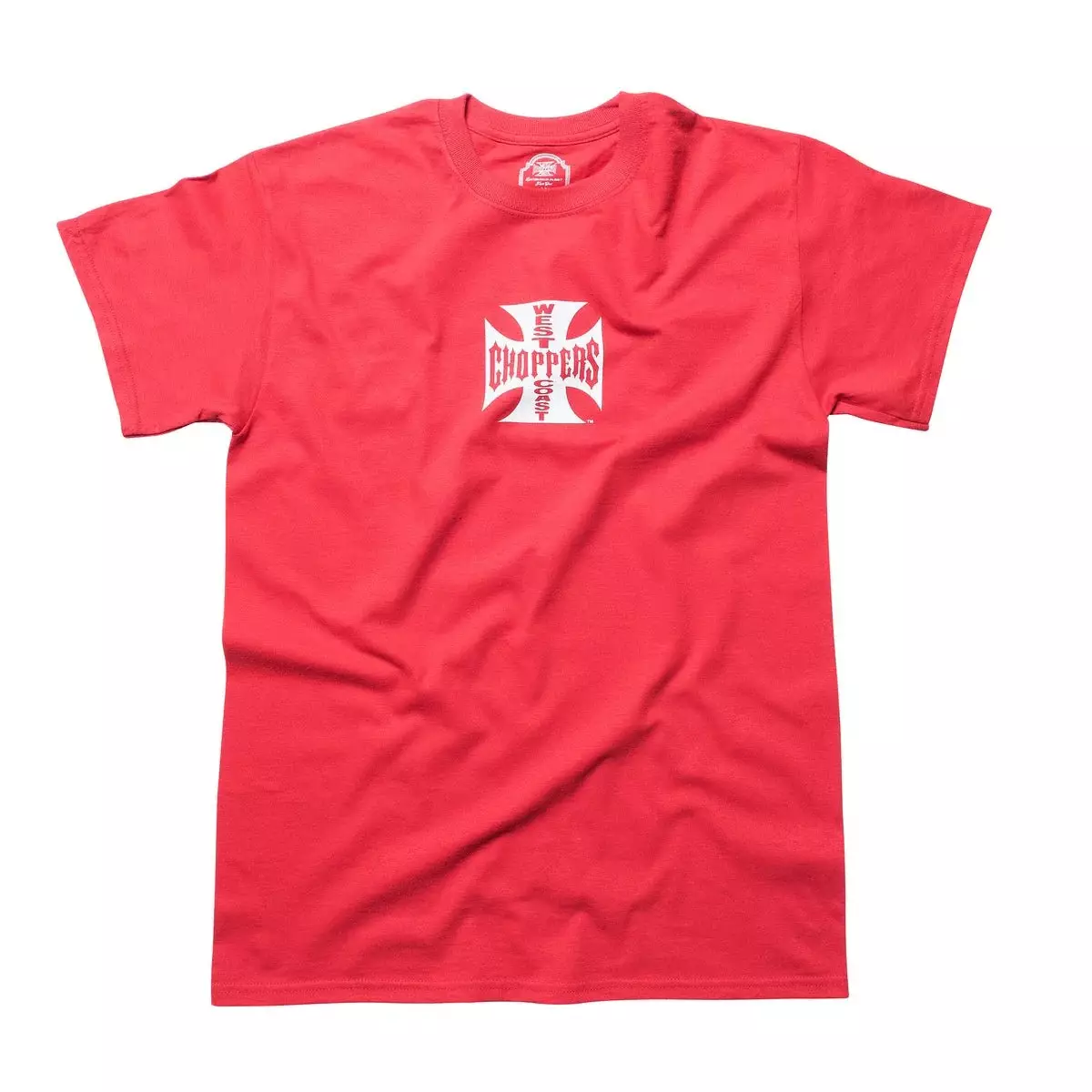 T-paita WCC West Coast Choppers-logolla, punavalkoinen. Rinnassa pieni printattu valkoinen logo ja selässä sama isona. 100 % puuvilla.