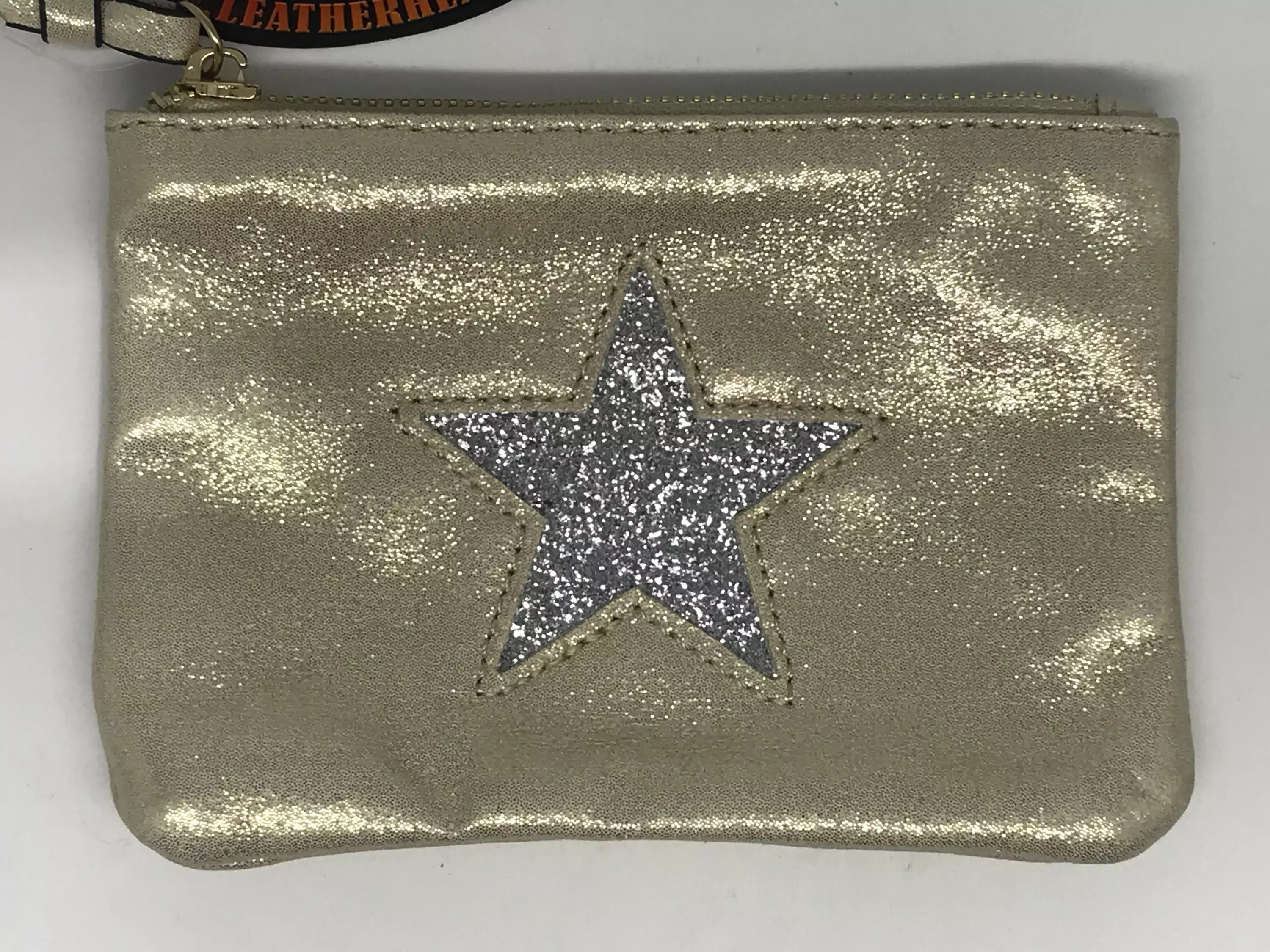 Pussukka hopeatähti, luonnonvalkoinen. Kimalteleva materiaali. Vetoketjukiinnitys, ketjussa nauhavedin, sisällä kuviollinen kangasvuori. Mitat: 16 cm x 11,5 cm