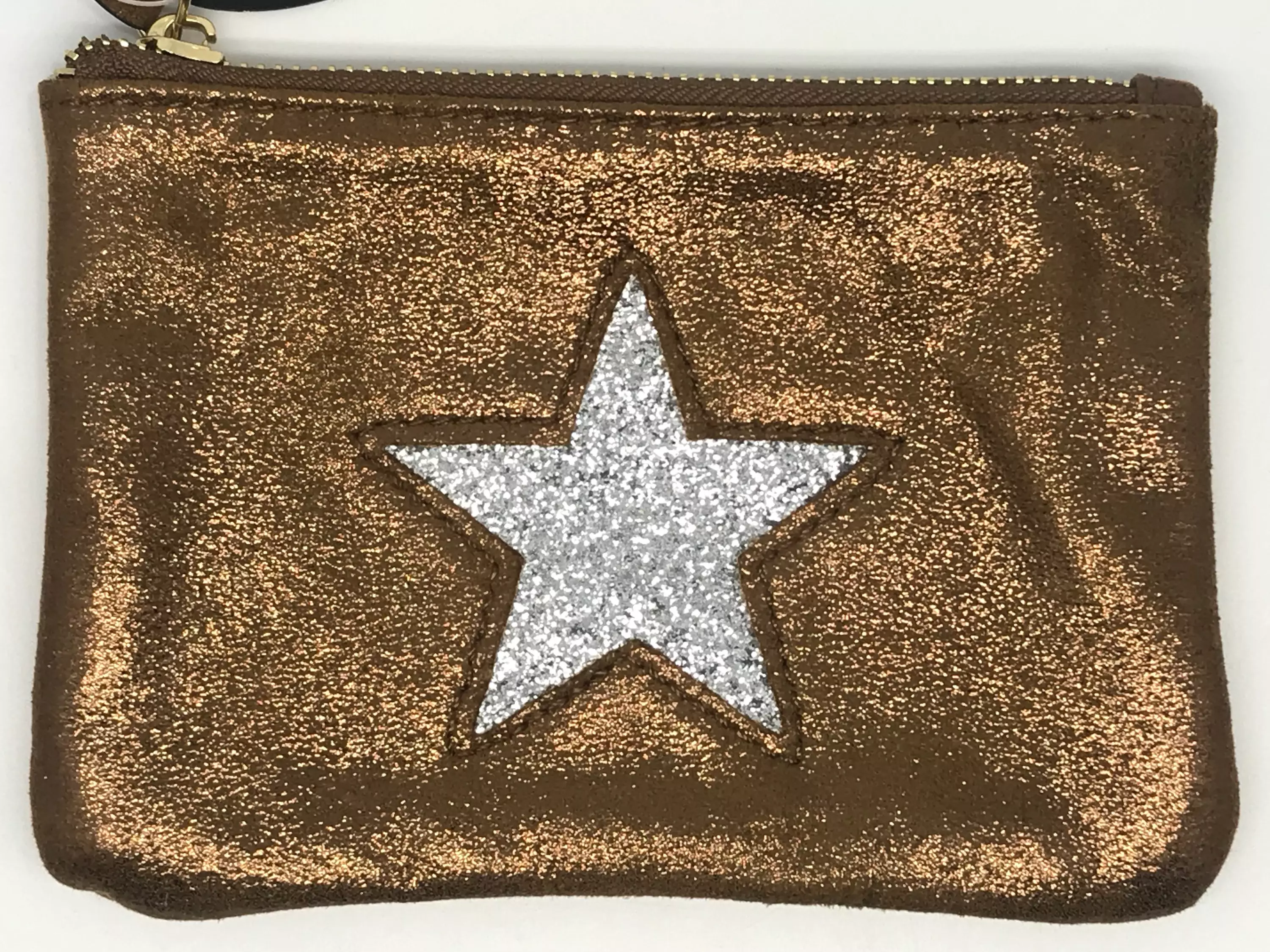 Pussukka hopeatähti, pronssinvärinen. Kimalteleva materiaali. Vetoketjukiinnitys, ketjussa nauhavedin, sisällä kuviollinen kangasvuori. Mitat: 16 cm x 11,5 cm