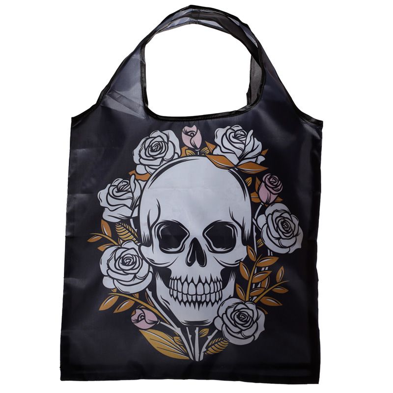 Taitettava ostoskassi Skulls & Roses. Kätevä varakassi mukaan, menee pieneen tilaan. Tarvittaessa avaa pikku pussukka ja TA-DAA -sinulla onkin lisää kassitilaa ! Kassin kuvassa mustalla taustalla iso kallo ja ympärillä muutama ruusu. Pikkupussukan mitat 8 x 7 x 2,5cm. Pikkupussukka kiristetään kiinni nyörillä ja suljetaan nyörikiristimellä. Pussukassa on lisäksi muovihakanen, jolla sen saa roikkumaan esim. laukun hihnaan. Avatun kassin mitat 38 cm x 39 cm. Materiaali 100 % polyesteri.