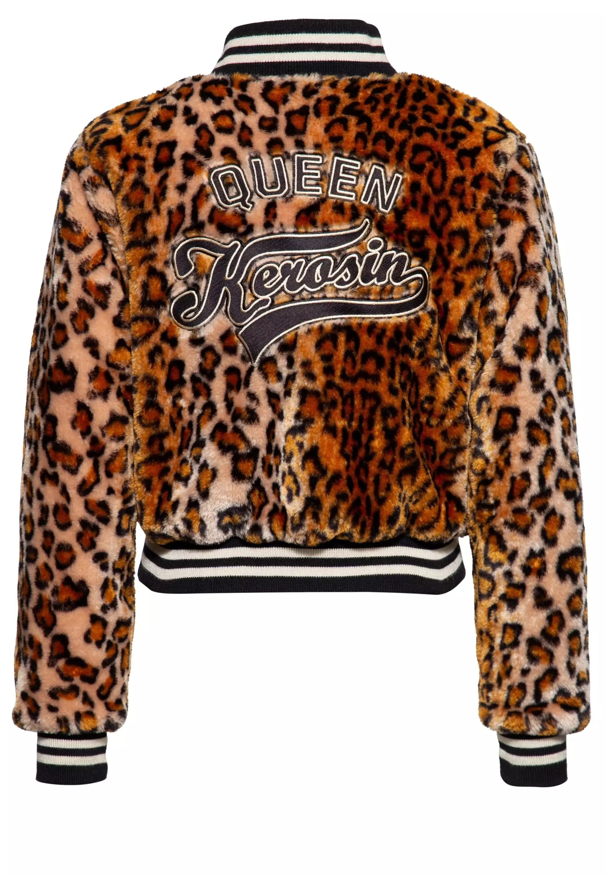 Takki Queen Kerosin Leopardi. Naisten vetoketjullinen teddykarvatakki leopardikuosilla. Edessä ja takana Queen Kerosin-brodeeraukset. Pääntiellä, hihansuissa ja helmassa pirteän raidalliset resorit. Edessä vetoketjulliset taskut, vuorissa povari vasemmalla puolella.
