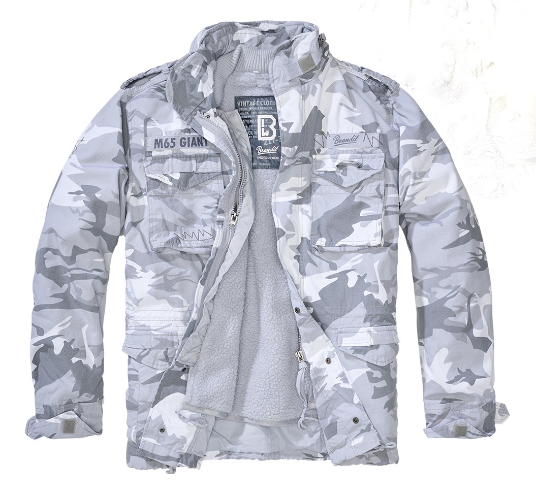 Talvitakki, Brandit M65 Giant, lämmin vintagetyylinen armeijatakki.Vetoketjulla irrotettavan, teddyvuorilla varustetun nailonsisuksen ansiosta tämä lämmin takki on omiaan kylmiin talvipäiviin. Päällitakki on kulutuspestyä puuvillaa ja soveltuu mainiosti välikausitakiksi ilman vuorta. M65-tyyliin takissa on 2 isoa rintataskua, 2 läppätaskua, sisääntyönnettävä, nyörillinen puuvillahuppu ja neppareilla suljettavat epoletit. Paljon yksityiskohtia: vasemmassa hihassa arvomerkki, rinnassa kangasmerkkejä.