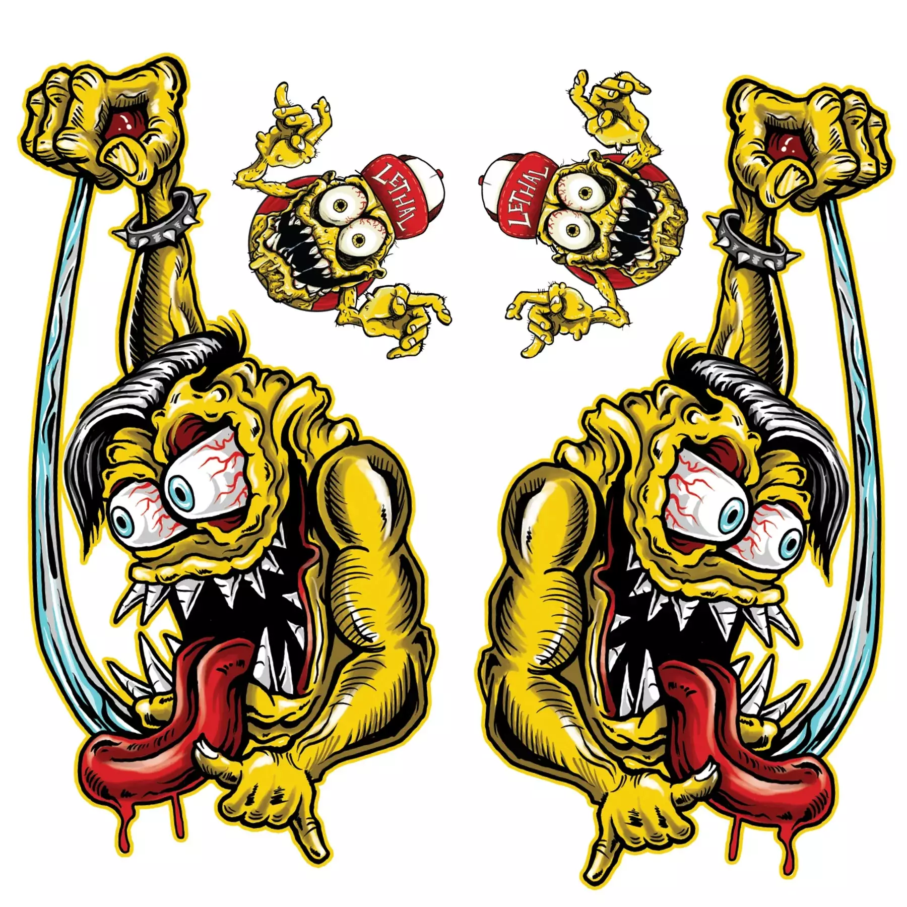 Tarra-arkki Monster. Tarra-arkissa on kaikkiaan neljä tarraa. Isoimman tarran koko n. 13 x 24,5 cm. Isoja, ja myös pienempiä tarroja on kahdet, ja ne ovat toistensa peilikuvia. Näin ne käyvät esim. moottoripyörän tankin kylkiin molemmille puolille.