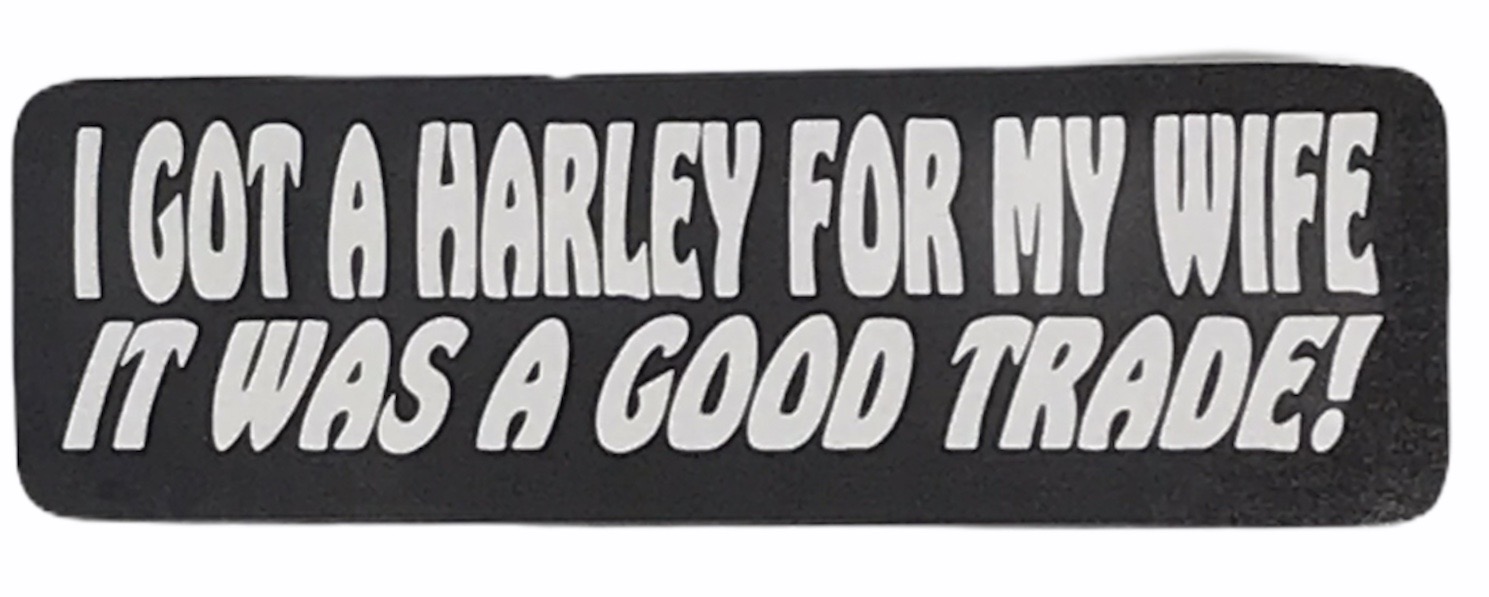 Tarra, I Got a Harley for My Wife. Kypärätarra, koko 9 x 3 cm. Musta tarra valkoisella tekstillä.