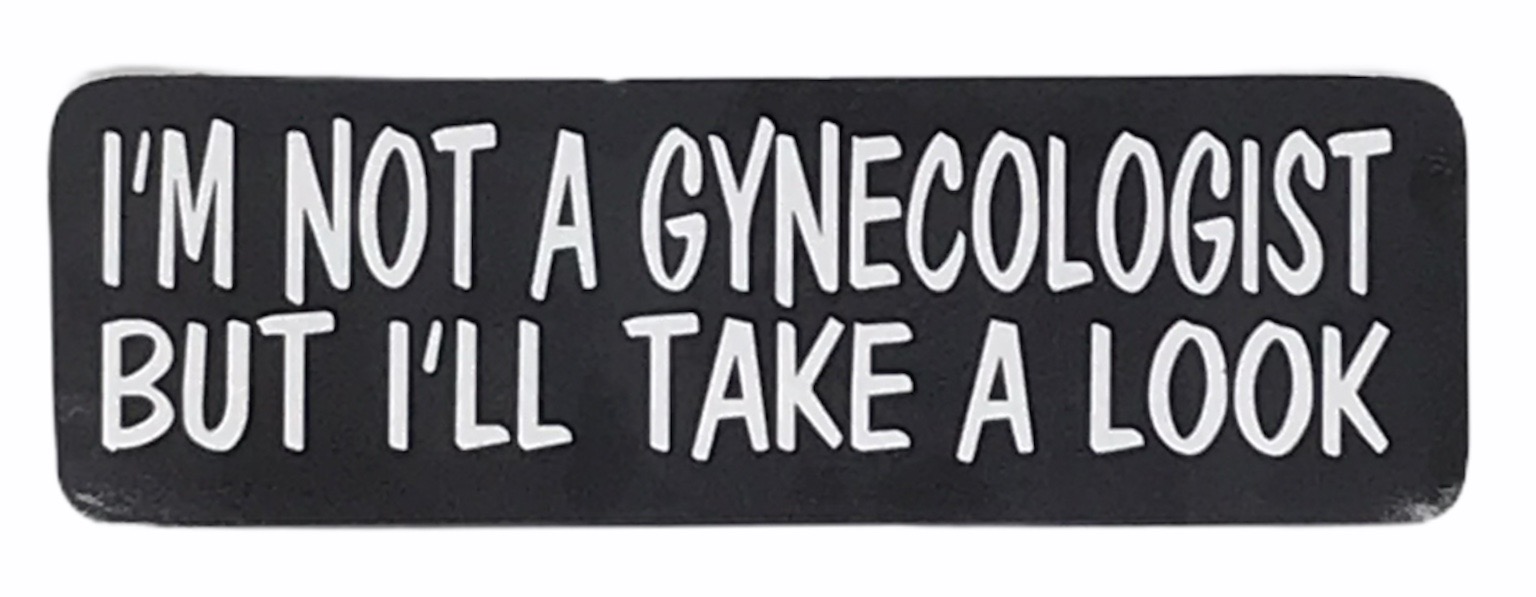 Tarra, I'm Not a Gynecologist But I'll Take a Look. Kypärätarra, koko 9 x 3 cm. Musta tarra valkoisella tekstillä.