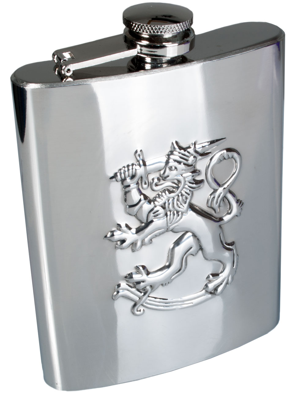 Taskumatti, Suomileijona. Taskumatti, ruostumatonta terästä. Tilavuus 8 oz eli noin 2,4 dl. Taskumatti tulee huuhdella hyvin ennen ensimmäistä käyttöä. Juomia ei tule säilyttää yhtäjaksoisesti matissa kolmea päivää pidempään. Käytön jälkeen huuhtele hyvin. Säilytä korkki raollaan. Hiilihappoiset juomasekoitukset saattavat "turvottaa" taskumattia. Happamat juomat (esim.tuoremehu) saattavat hapettaa terästä.