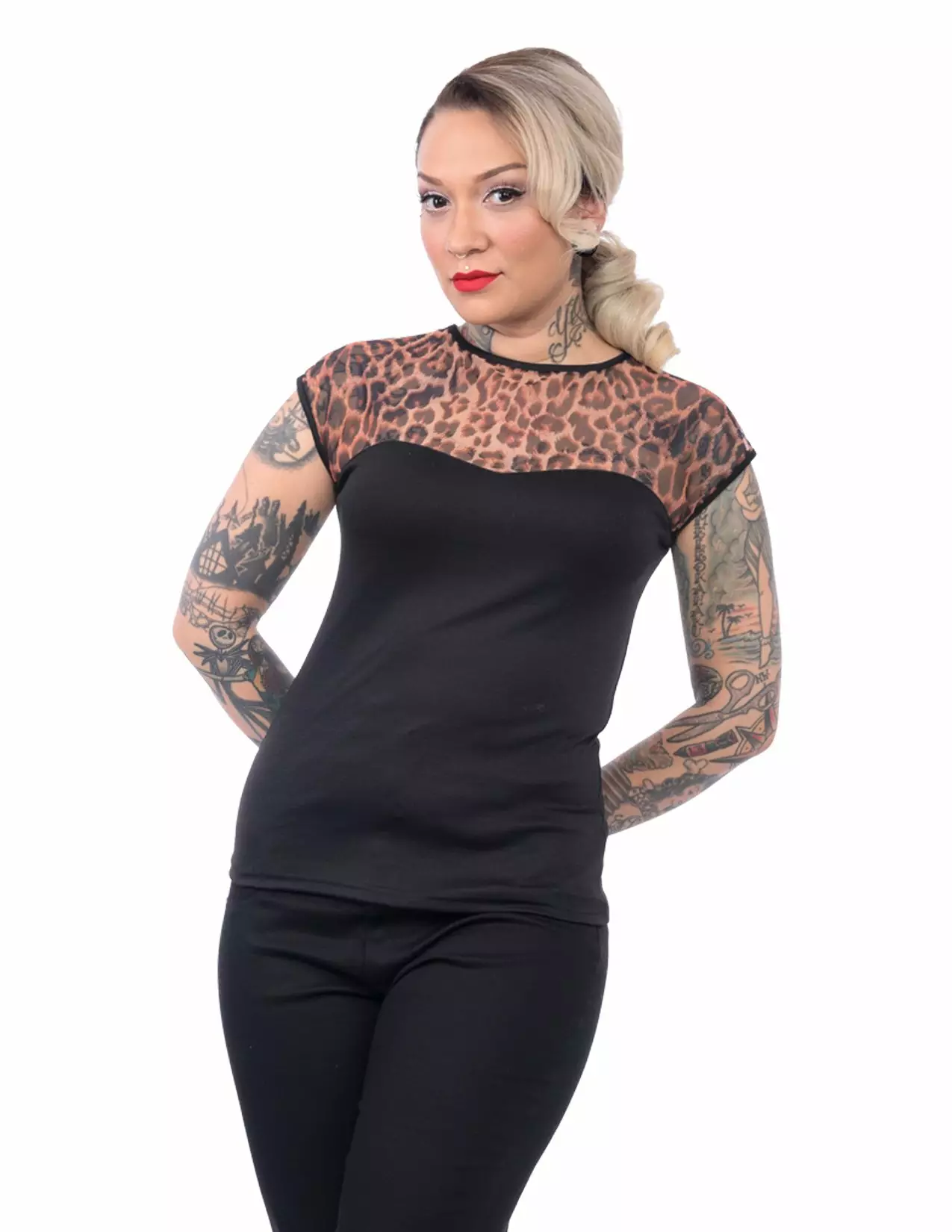 Toppi Miss Fancy, leopardi-kuvio. Musta naisten toppi, jossa yläosa mustalla kantattua leopardi-kuvioista verkkokangasta.