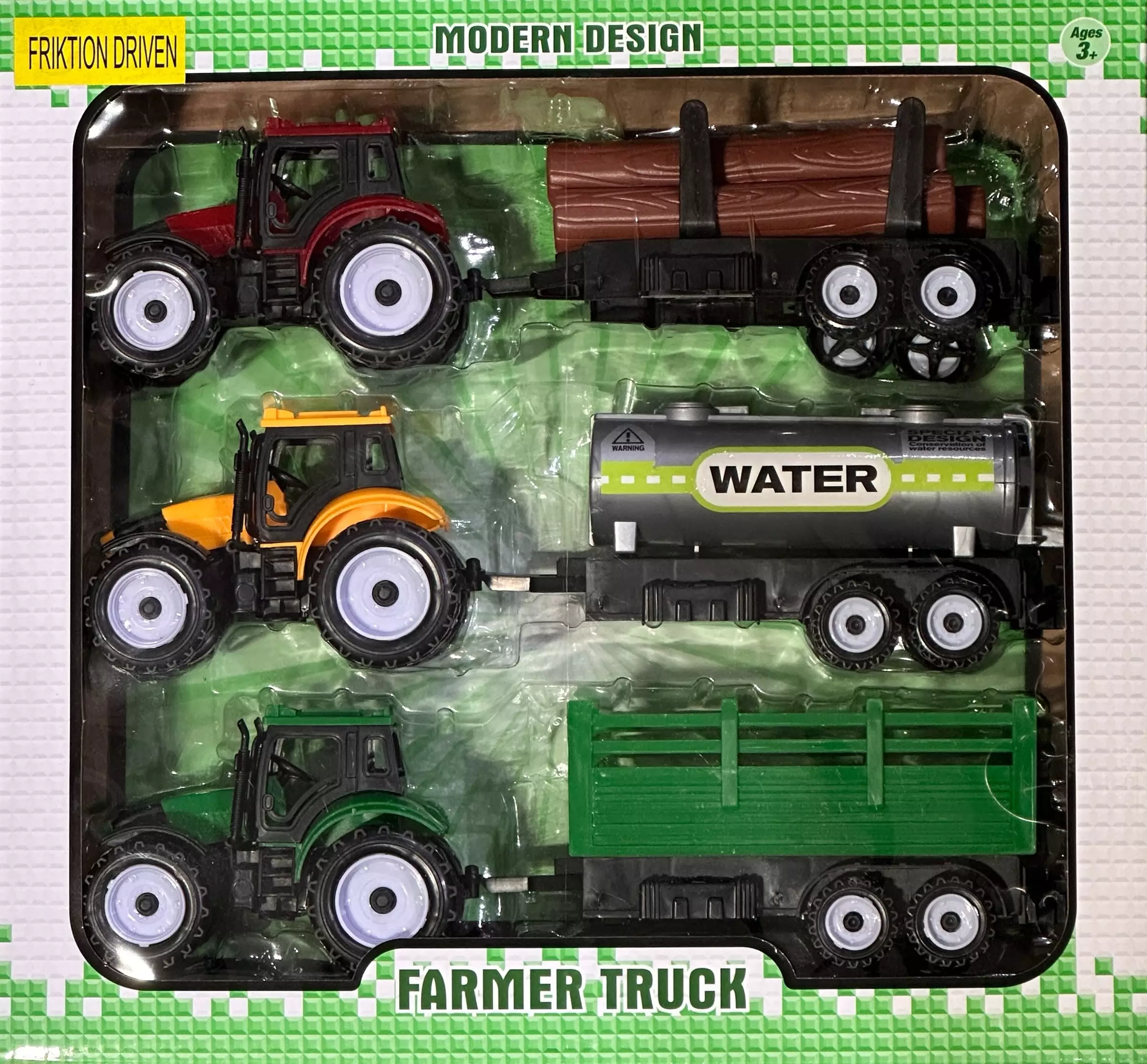 Traktorisetti, kolme erilaista kokoonpanoa. Materiaali muovia. Pakkauksen koko 33,5 x 31 x 7,5 cm. Ei suositella alle 3-vuotiaille, sisältää pieniä osia.
