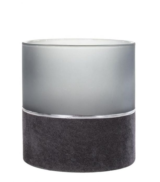 Tuikkukuppi Harmaa hopearaita. Kaunis himmeälasinen tuikkulasi, jonka alaosa on ylellistä samettia. Somisteena lisäksi hopeanvärinen raita. Mitat: pohjan halkaisija 65 mm ja korkeus 80 mm.