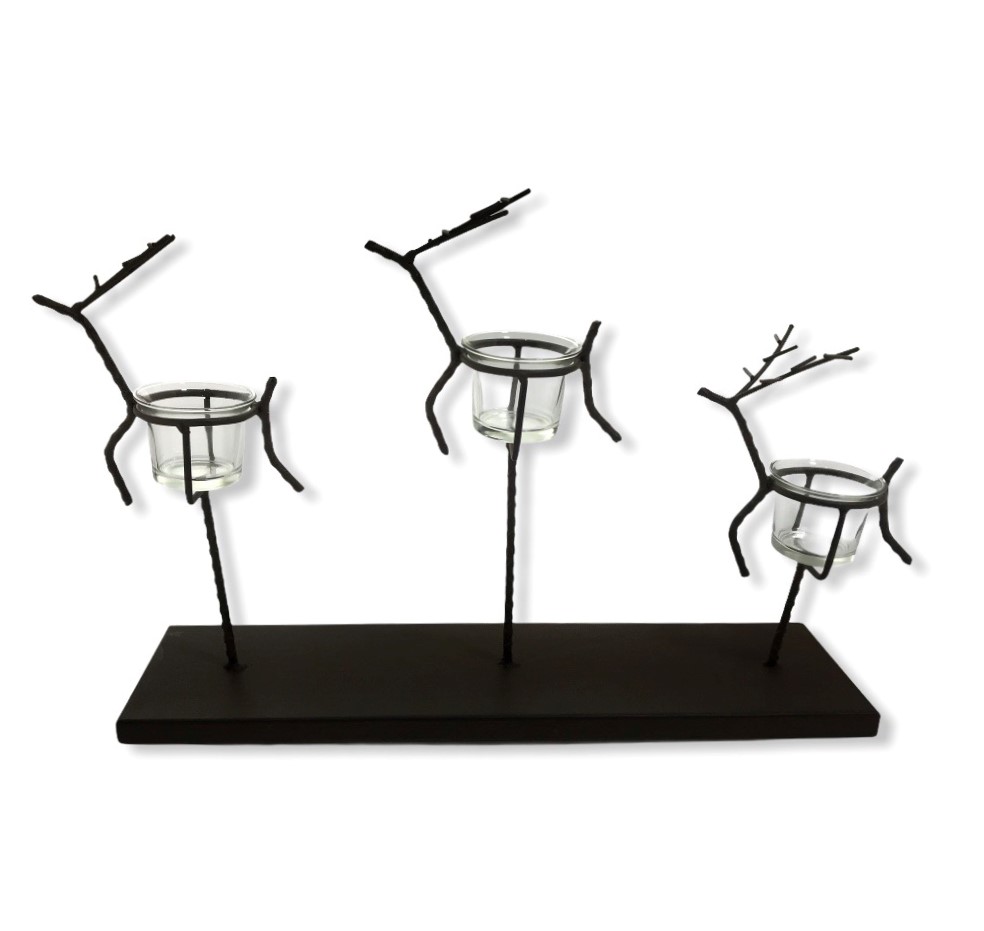 Tuikkukynttelikkö Poro, metallia. Ruskea, metallinen kynttelikkö, jossa kolme irroitettavaa tuikkulasia. Kynttelikön mitat: Pituus 40 cm, leveys 10 cm ja korkeus 29 cm.