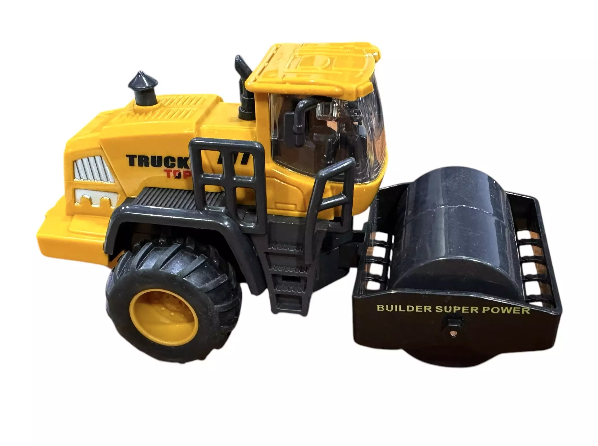 Työkone katujyrällä, muovia. Työkoneen pohjassa on nappi, josta painamalla jyräosa irtoaa. Pyörät pyörivät ja painamalla ajoneuvo maata vasten pienen pätkän, ajoneuvo lähtee liikkeelle. Ajoneuvon mitat jyrän kanssa 19,5 x 8 cm. Mittasuhde 1:55.