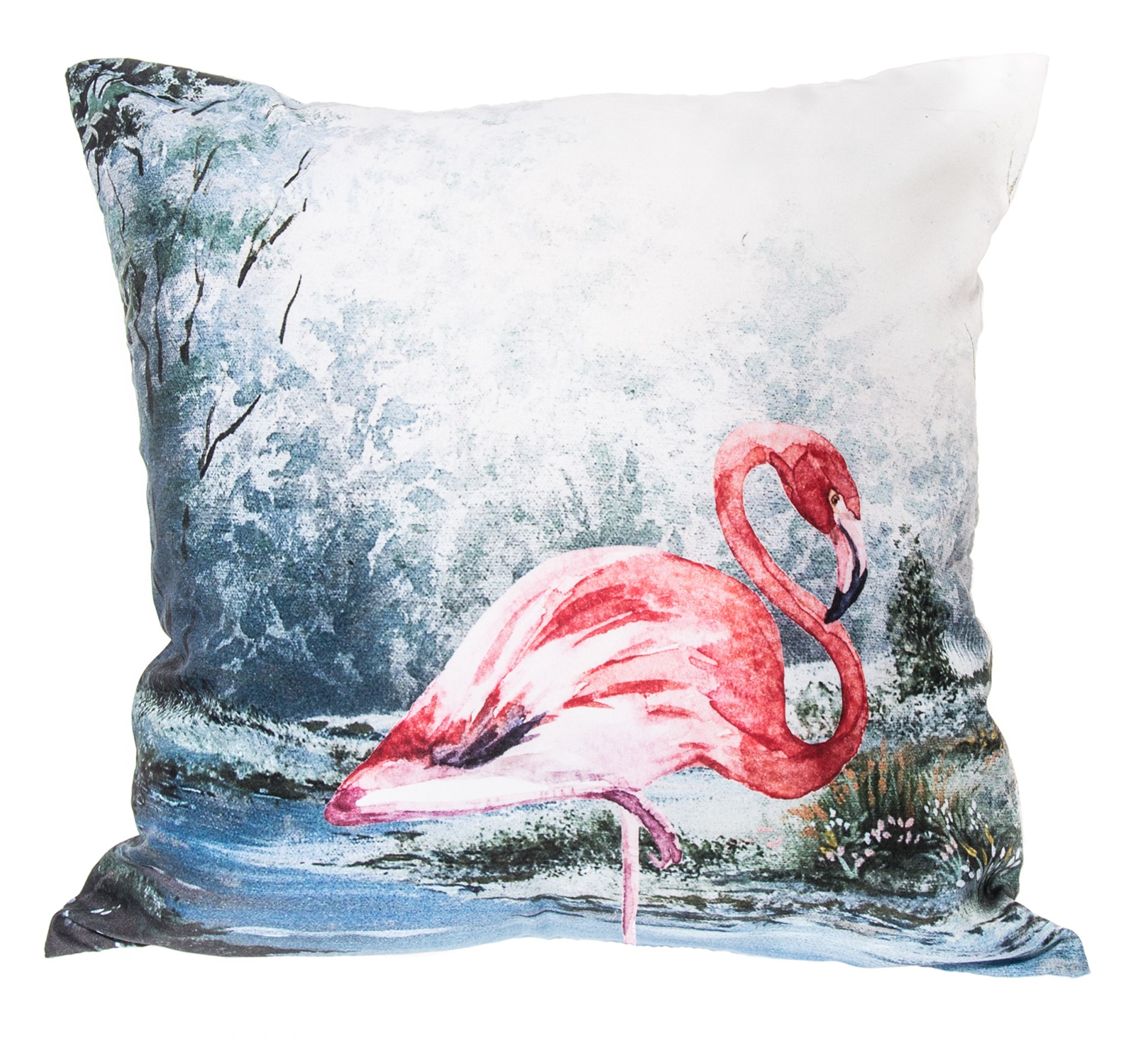 Tyyny, Flamingo. Tyynyn mitat 45 x 45 cm. Tyynyn päällipuolella painettu flamingon kuva, taustapuoli on yksivärinen valkoinen, ja taustassa on myös vetoketju, jotta päällisen voi irroittaa pestäväksi. Materiaali 100 % polyesteri.