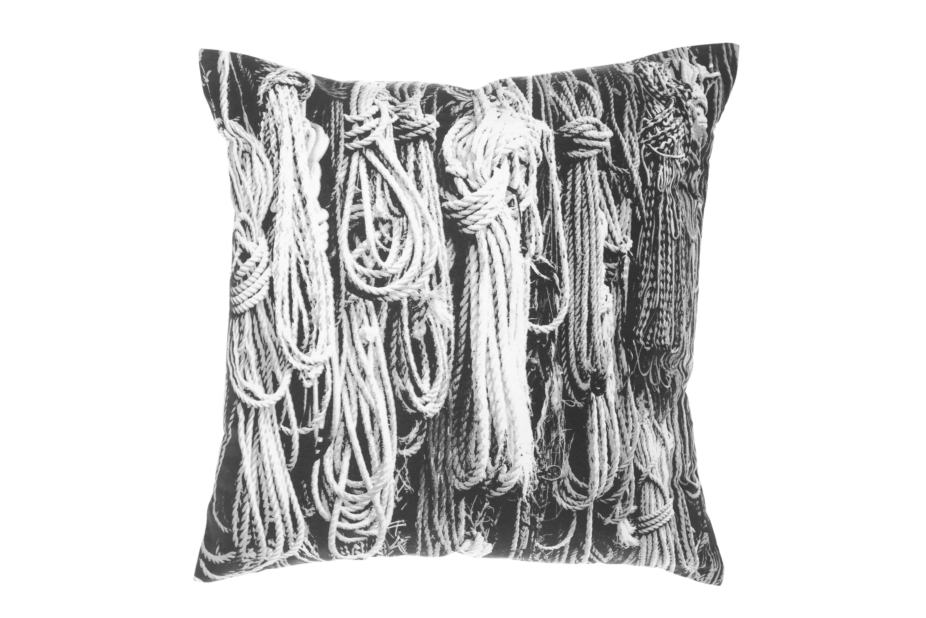 Tyyny, Rope. Tyynyn mitat 45 x 45 cm. Tyynyn päällipuolella painettu kuva, taustapuoli on yksivärinen valkoinen, ja taustassa on myös vetoketju, jotta päällisen voi irroittaa pestäväksi. Päällisen materiaali puuvillaa, täyte polyesteria.