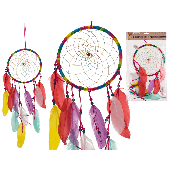Multicoloured fabric Dreamcatcher, with feather, ca 54 x 20 cm, in polybag with headercard