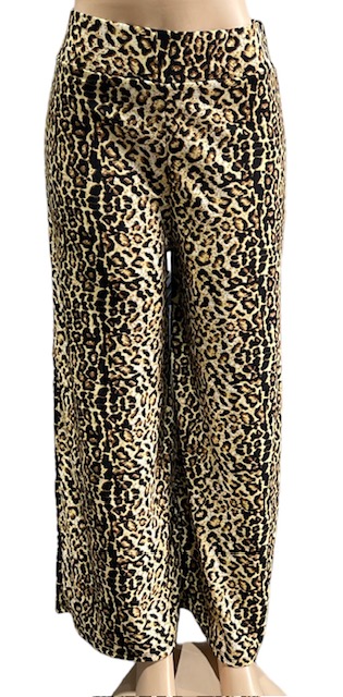 Väljät Leopardihousut, vaalea. Suora, leveä lahje, kuminauhavyötärö. Materiaali joustavaa neulosta.