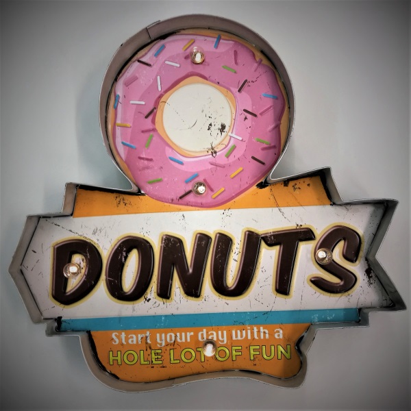 Valokyltti Donuts. Peltinen valokyltti luo tunnelmaa kotikeittiöösi, tai miksei ihan varsinaisen kahvilan tai konditoriankin seinälle. LED-valot toimivat AA-paristoilla (ei sisälly pakkaukseen). Kyltin mitat 35 x 5 x 33 cm, paino n. 590 g.