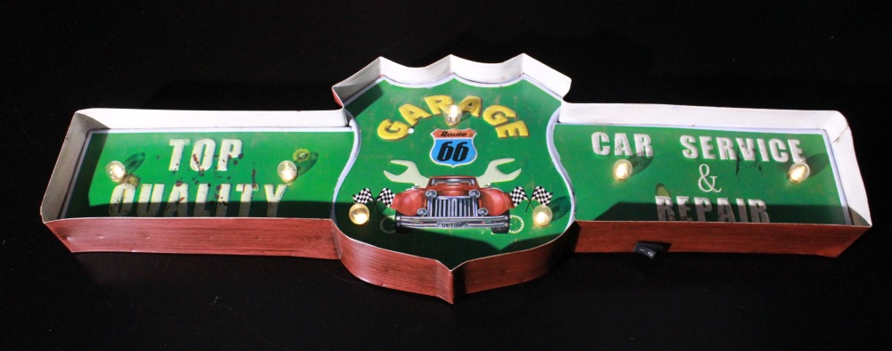 Valokyltti Garage, Car Service & Repair. Peltinen kohokuvioitu sisustuskyltti LED-valoilla. Tällä kyltillä viimeistelet autotallisi, ja kruunaat itsesi moottorinrassaajien Top Quality-joukkoon. Toimii AA-paristoilla (ei sisälly pakkaukseen). Kyltin mitat 62 x 5 x 20,3 cm, paino n.730 g.