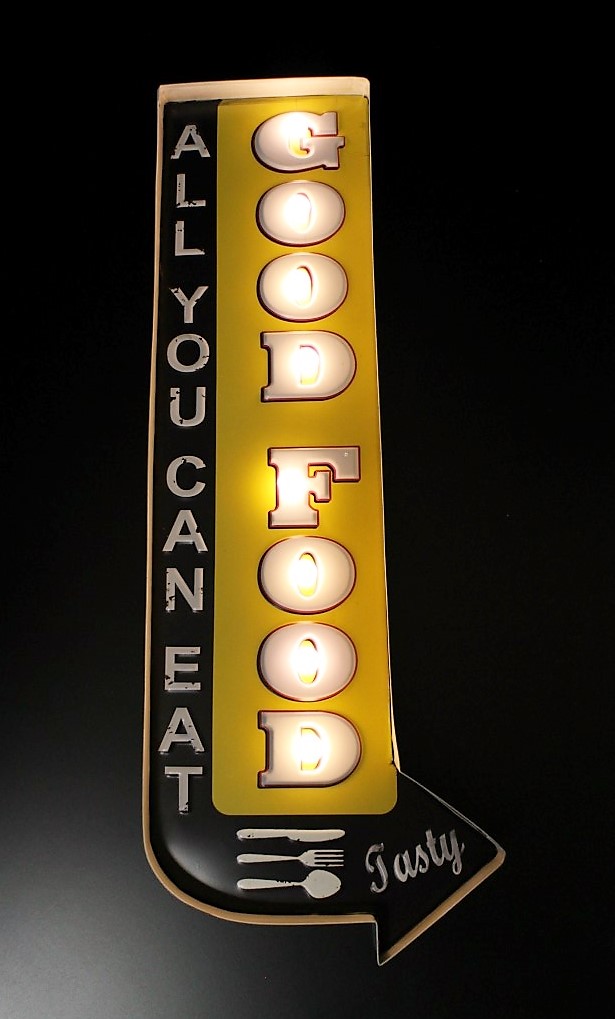 Valokyltti Good Food. "All You Can Eat ! Good Food ! Tasty ! Iso ja näyttävä kohokuvioitu peltikyltti LED-valoilla. Toimii niin kotikeittiössä kuin ravintolassakin. Kyltin koko 26 x 5 x 69 cm, paino n. 935 g. LED-valo toimii AA-paristoilla (ei sisälly pakkaukseen).