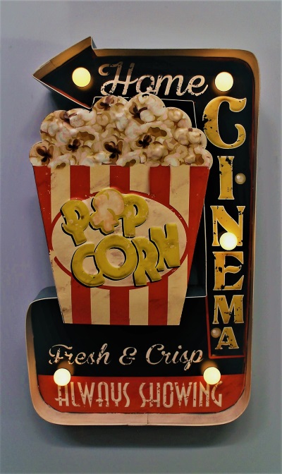 Valokyltti Home Cinema. Peltinen "Home Cinema - Fresh and Crisp Pop Corn -Always Showing"-kyltti LED-valoilla. Kotiteatterin tunnelman viimeistelijä. Led-valot toimivat AA-paristoilla (ei sisälly pakkaukseen). Kyltin koko 24 x 5 x 41 cm, paino n. 720 g.
