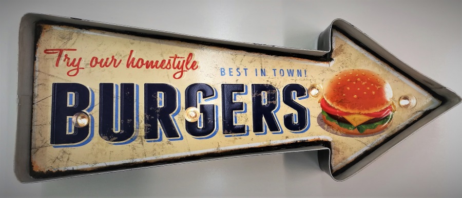 Valokyltti Homestyle Burgers. Peltinen "Try Our Homestyle Burgers -Best In Town"-kyltti LED-valoilla. Tämän Vintage-henkisen kyltin valossa oman burgerin tuotekehittely saa aivan uusia vivahteita. LED-valot toimivat AA-paristoilla (ei sisälly pakkaukseen). Kyltin mitat 41 x 5 x 16 cm ja paino n. 430 g.