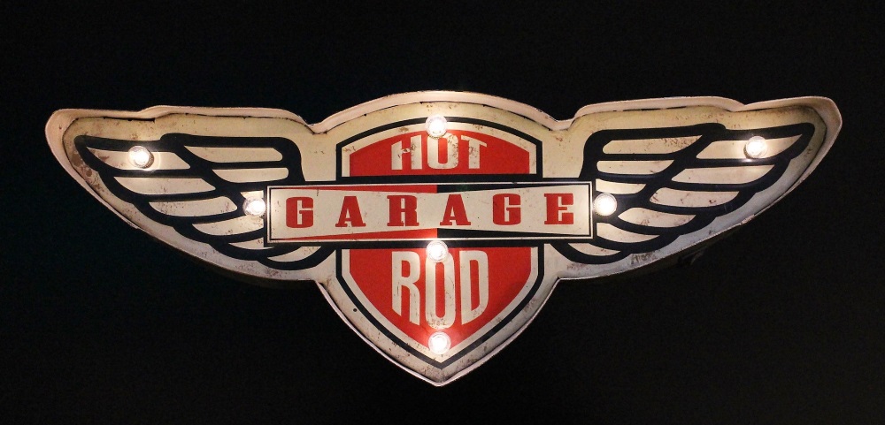 Valokyltti Hot Rod Garage. Vintage-tunnelmaa autotalliin tai kerhohuoneeseen ! Peltinen kohokuvioitu sisustuskyltti LED-valoilla, jotka toimivat AA-paristoilla (ei sisälly pakkaukseen). Kyltin koko 53,5 x 5 x 19 cm ja paino on n. 560 g.
