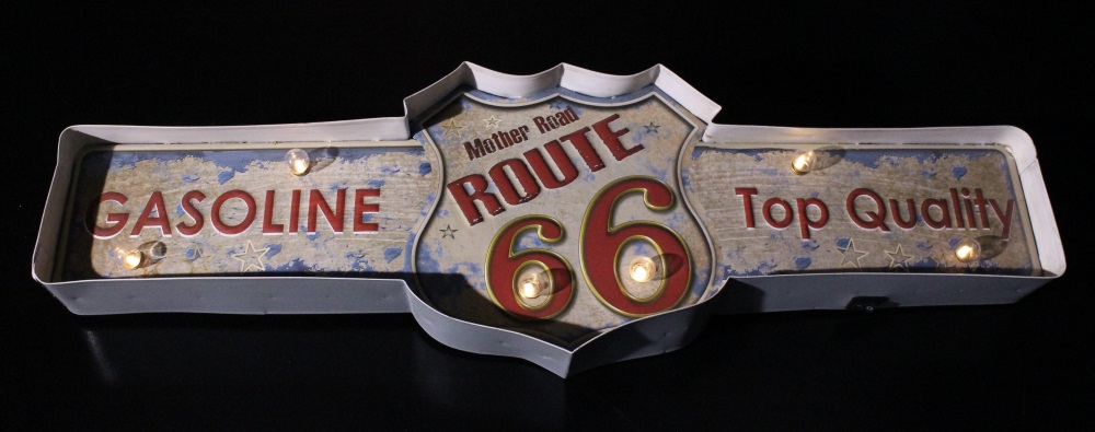 Valokyltti Mother Road Route 66, Gasoline. Top Quality. Route 66-fanin ehdoton hankinta !Peltinen LED-kyltti, toimii AA-paristoilla (ei sisälly pakkaukseen). Koko 61 x 5 x 18,5 cm, paino n. 680 g