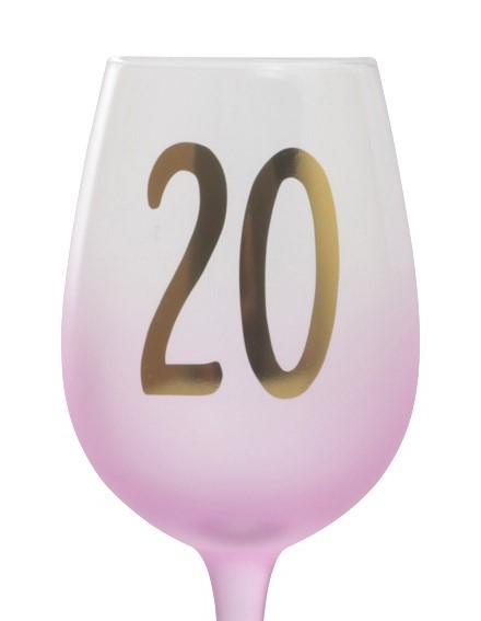 Viinilasi 20 pinkki. Kaunis viinilasi mattapinkillä jalalla, josta väri hälvenee lasin yläosaa kohti. Lasissa vuosipäivän numero kullanvärisin numeroin. Lasin mitat: korkeus n. 22,5 cm, jalkaosan pohjan halkaisija n. 80 mm, lasinsuun halkaisija n. 70 mm ja leveimmillään lasiosa on n. 90 mm. Toimitetaan vaaleansävyisessä kartonkisessa lahjapakkauksessa. Pakkauksen mitat 26 x 12 x 9 cm.
