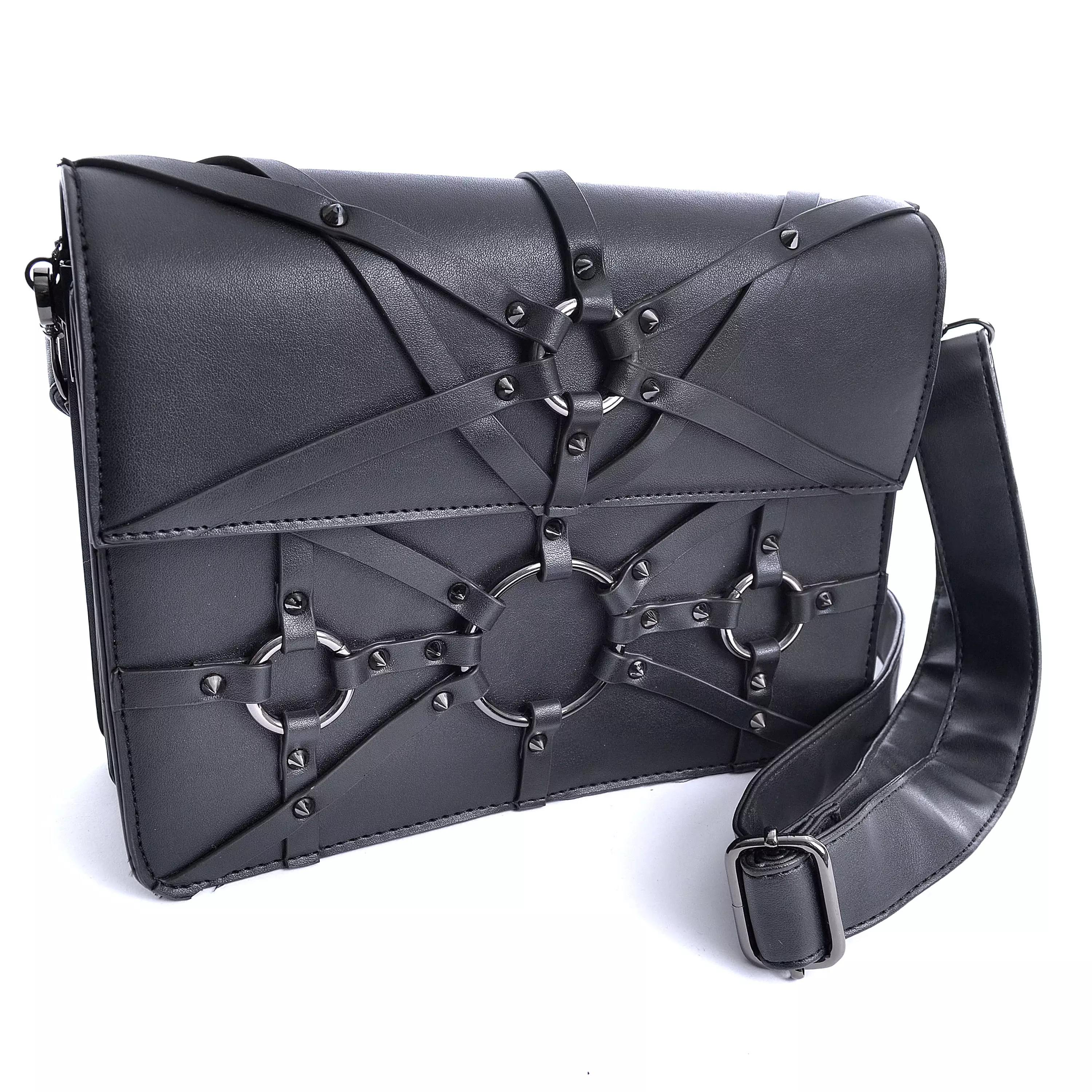 Vixxsin Morgana käsilaukku. Musta keinonahkalaukku runsailla yksityiskohdilla. Mustan krominväriset kartioniitit, metallirenkaat ja keinonahkaremmit tuovat näyttävyyttä ja asennetta laukun ulkonäköön. Laukun takaosassa olevat nahkaremmit mahdollistavat jopa laukun kiinnittämisen vyötärölle vyön avulla. Laukun sisäosa on jaettu kahteen eri lokeroon, joiden välissä on metallivetoketjulla varustettu tasku. Lisäksi toisessa puolikkaassa on avotaskuja ja toisessa vielä sivutasku metallivetskalla. Laukussa on irroitettava, säädettävä olkahihna. Laukun mitat 27 x 21 x 8 cm. Materiaali PVC, vuori polyesteria.