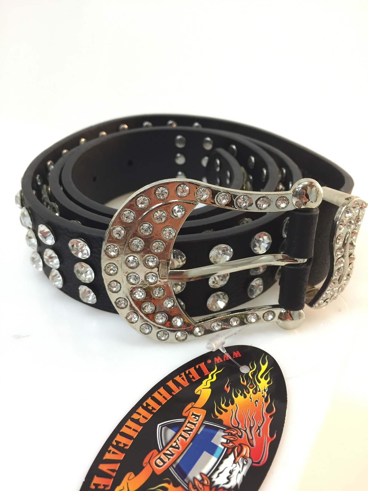 Vyö, Zirkoneilla, 3rivinen. Keinonahkavyö upeilla koristezirkoneilla. Zirkonit ovat kuin timantteja ja niitä on kolmessa rivissä. VYÖN LEVEYS = 3,2cm