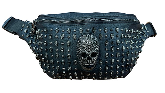 Vyölaukku Isolla Kallokoristeella. Metalliniitit, sekä iso metallinen pääkallokoriste laukun etuosassa. Takaosassa vetskatasku, ja molemmissa vetoketjuissa metalliset kallovetimet. Laukun sisällä vuorissa on myös ketjullinen sisätasku. Vuori mustavalkoista kallokuvioista kangasta.