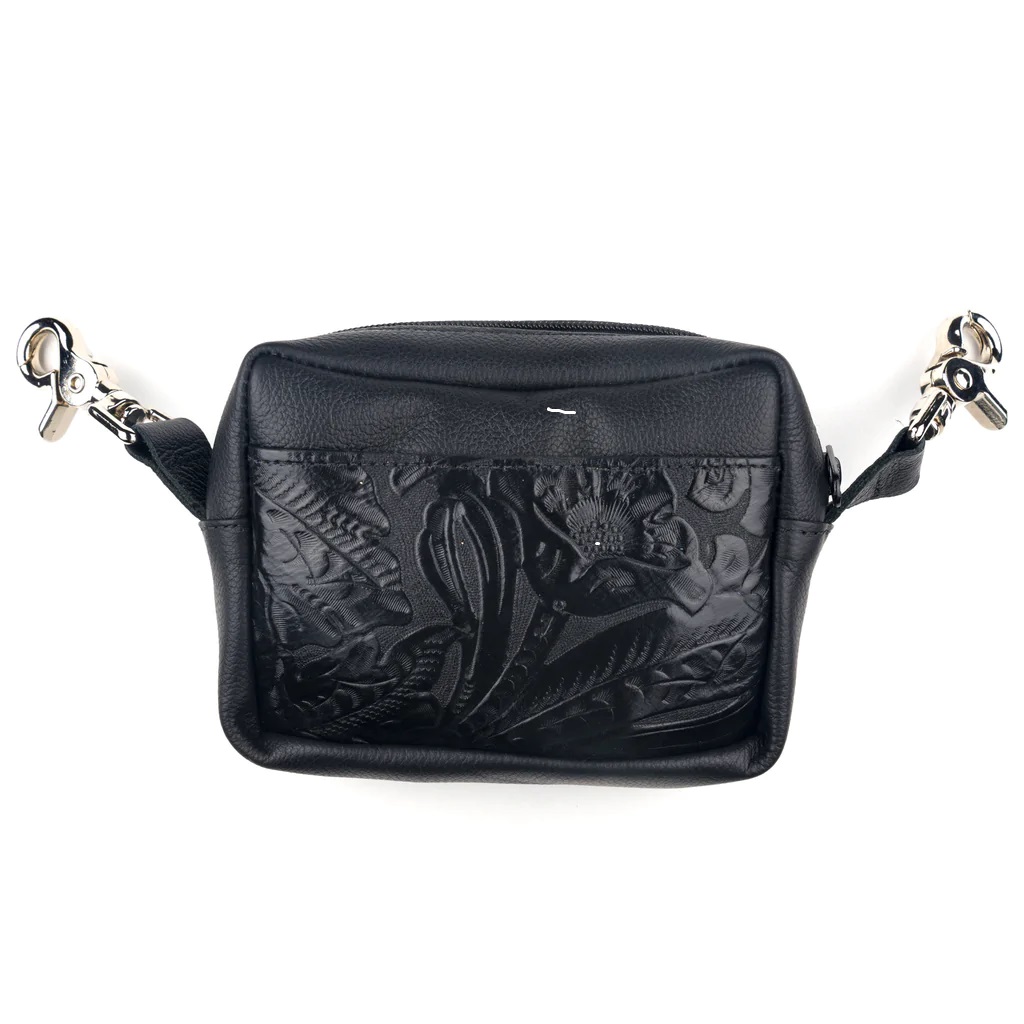 Vyölenkkilaukku, musta. Kätevä nahkainen pikkulaukku, joka jättää kädet vapaaksi. Laukun saa ripustettua metallihakasilla farkun vyölenkkeihin. Vetoketjullisen pikkulaukun pinnassa kohokuvio, sekä toisella puolella avotasku. Laukun mitat 145 cm x 110 cm x 65 cm.