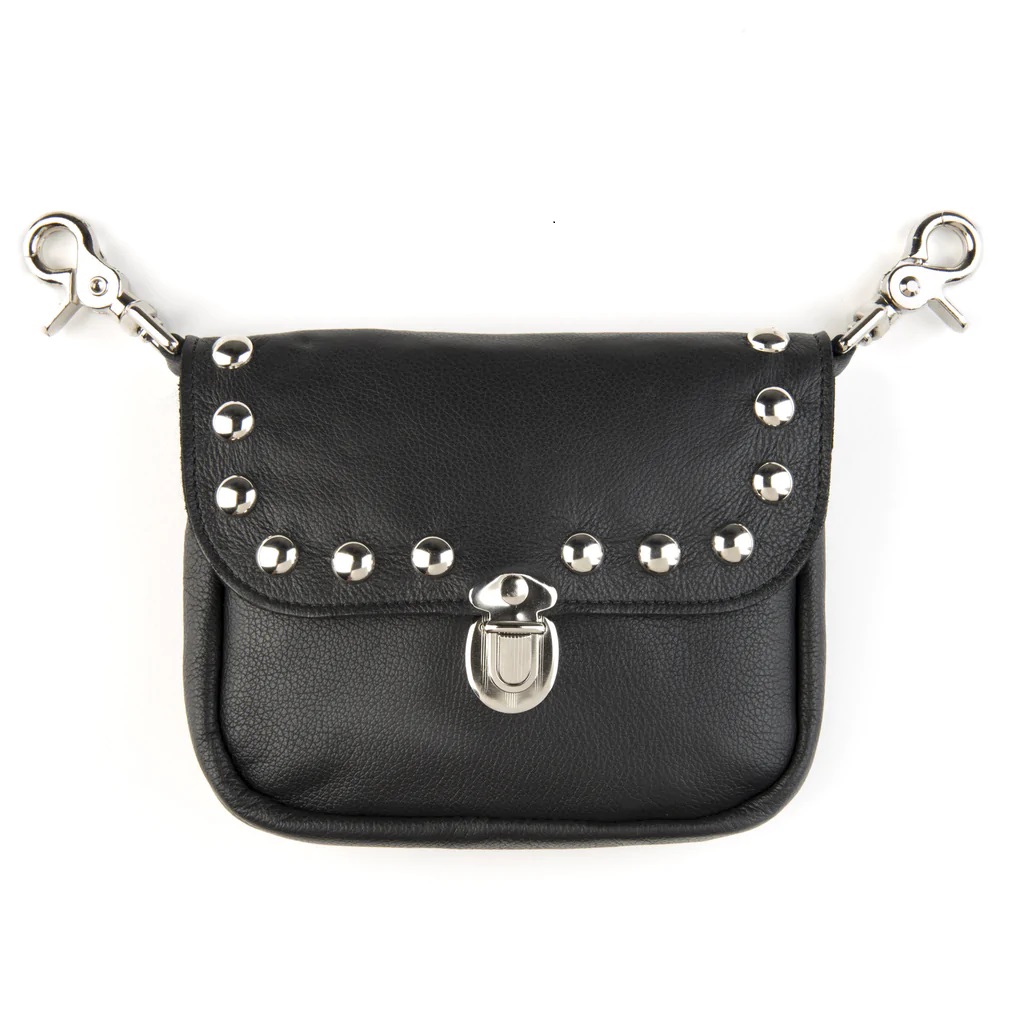 Vyölenkkilaukku niiteillä, musta. Kätevä nahkainen pikkulaukku, joka jättää kädet vapaaksi. Laukun saa ripustettua metallihakasilla farkun vyölenkkeihin. Pikkulaukun sisäpuolella pieni korttitasku. Laukun mitat 175 cm x 140 cm x 30 cm.