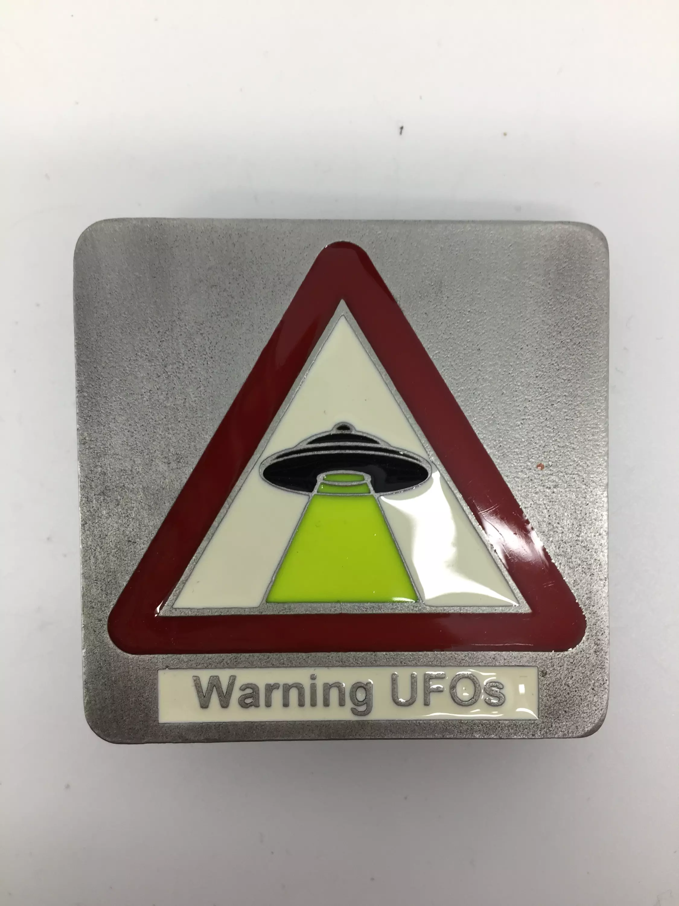 Vyönsolki, Warning Ufos. Soljen koko 5,3 x 5,3 cm. Solki sopii maksimissaan 4 cm leveään vyöhön.