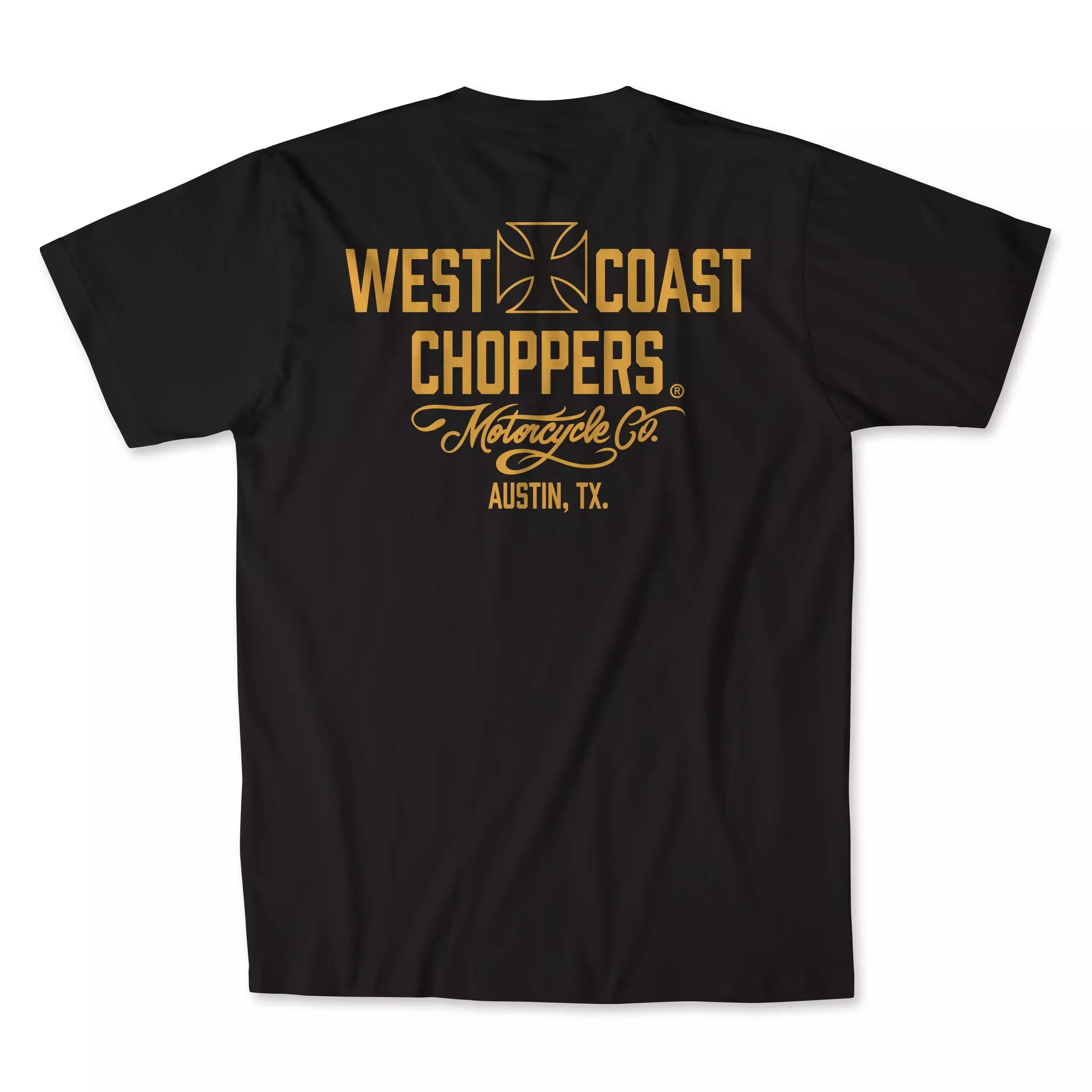 WCC T-paita Black and Yellow. Miesten T-paita 100 % puuvillaa. Musta paita keltaisella printillä. Selässä isompi printti ja edessä vasemmassa rinnassa vastaavanlainen printti pienessä koossa.